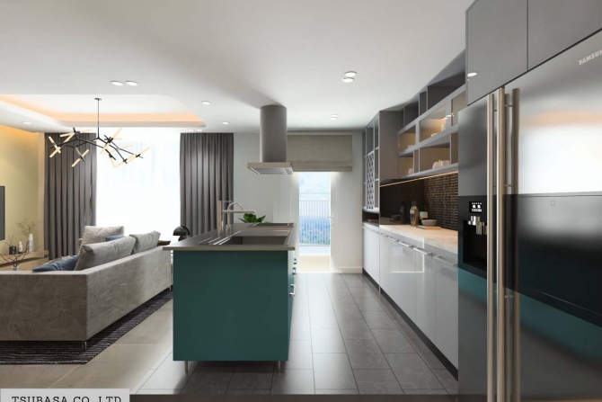 Căn hộ chung cư đã được TSUBASA thiết kế kết hợp các phòng sinh hoạt chung là nhà bếp, phòng khách và phòng ăn thành một không gian mở. Phòng chức năng và phòng ngủ với tiêu chí tối giản nhưng vẫn đáp ứng đủ sự thoải mái cho người sử dụng. Màu sắc được lựa chọn là sự kết hợp giữa sở thích và phong thủy, đủ sự sang trọng, ấm cúng và độc đáo như mong muốn của gia chủ.